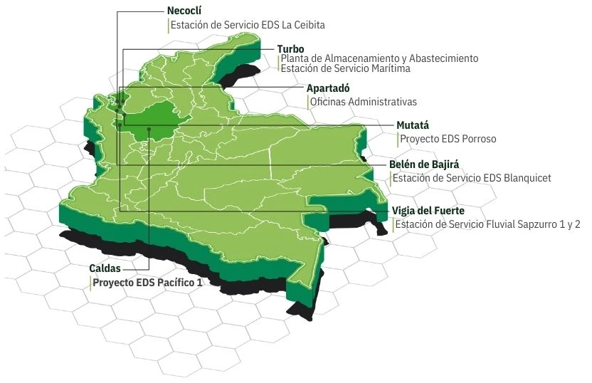 Para el año 2030, ser reconocidos en la región del Urabá Antioqueño y en las zonas ribereñas del Río Atrato en el Chocó como una empresa comercializadora líder y competitiva en combustibles y lubricantes, garantizando un abastecimiento continuo, seguro y de calidad en toda la cadena de suministro para los sectores industrial, terrestre, marítimo y fluvial.